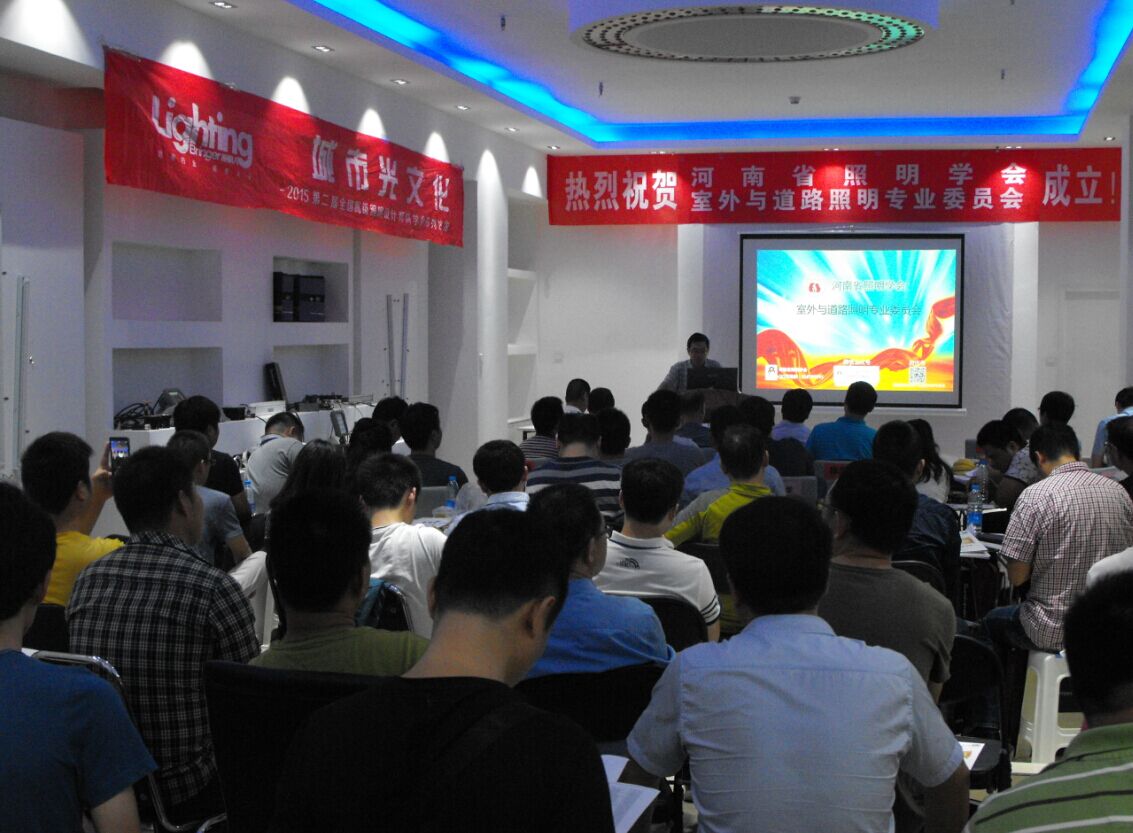 9月19日下午,河南省照明學(xué)會(huì)室外與道路照明專業(yè)委員會(huì)成立大會(huì)暨2015第二屆全國(guó)高級(jí)照明設(shè)計(jì)師沙龍?jiān)谖挥卩嵵葜胁?/span>LED交易中心二樓的河南省照明學(xué)會(huì)學(xué)術(shù)交流與培訓(xùn)中心舉行。河南省照明學(xué)會(huì)理事長(zhǎng)王繼援、副理事長(zhǎng)郭德合、秘書長(zhǎng)姚凱、鄭州市照明燈飾管理處總工李凱、新境界照明設(shè)計(jì)總監(jiān)馮健、中國(guó)照明人網(wǎng)總經(jīng)理姚怡同、樂(lè)雷光電技術(shù)(上海)有限公司研發(fā)副總彭解紅、河南天擎機(jī)電設(shè)備有限公司總經(jīng)理陳志豪、歐量(上海)照明有限公司總經(jīng)理甄密肖、上海文彩照明科技有限公司總經(jīng)理顧斌、廣州亮美集燈飾有限公司銷售總監(jiān)姜瀟等領(lǐng)導(dǎo)嘉賓和來(lái)自泛光照明、新中飛照明、生茂光電、清華同方等工程公司和廠家代表近80人與會(huì)。