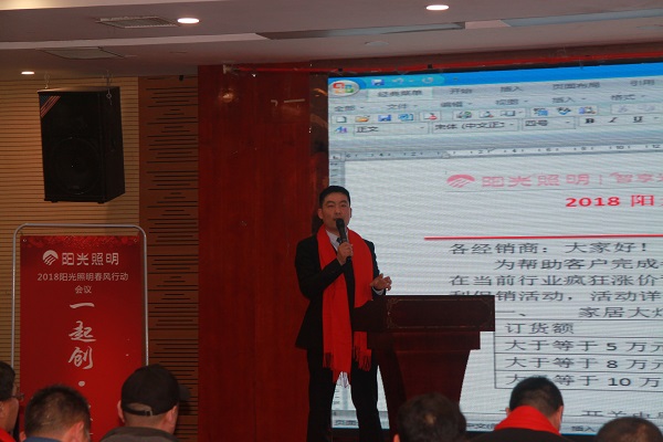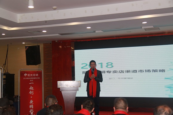 接著,安徽陽光照明電器有限公司家居流通事業(yè)部總經(jīng)理盧光軍對(duì)陽光照明的企業(yè)文化和家居、流通渠道戰(zhàn)略進(jìn)行了講解。他表示,在2018年,陽光照明主要從以下四個(gè)方面進(jìn)行布局:一,加強(qiáng)基礎(chǔ)建設(shè);二,加強(qiáng)市場(chǎng)投入;三,打造樣板市場(chǎng);四,提升服務(wù)滿意度。同時(shí),還要做好以下四個(gè)方面的提升工作:一是終端提升。加大專賣店和工廠店的建設(shè)速度;二是產(chǎn)品提升。不斷推出爆款,優(yōu)化產(chǎn)品結(jié)構(gòu);三是市場(chǎng)提升。以結(jié)果為導(dǎo)向,考核過程;四是服務(wù)提升。以客戶滿意度為目標(biāo)。2018年,陽光照明將會(huì)以嶄新的面貌,貼心的服務(wù)呈現(xiàn)給各級(jí)經(jīng)銷商,呈現(xiàn)給行業(yè),呈現(xiàn)給用戶。