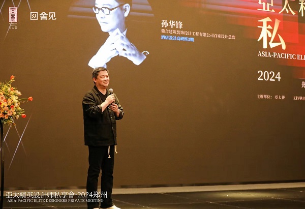▲鼎合建筑裝飾設(shè)計(jì)工程有限公司首席設(shè)計(jì)總監(jiān)孫華鋒致辭。他分享了自己在多年酒店設(shè)計(jì)實(shí)踐中的心得體會,并希望藉此契機(jī)與現(xiàn)場設(shè)計(jì)師開展深入交流。